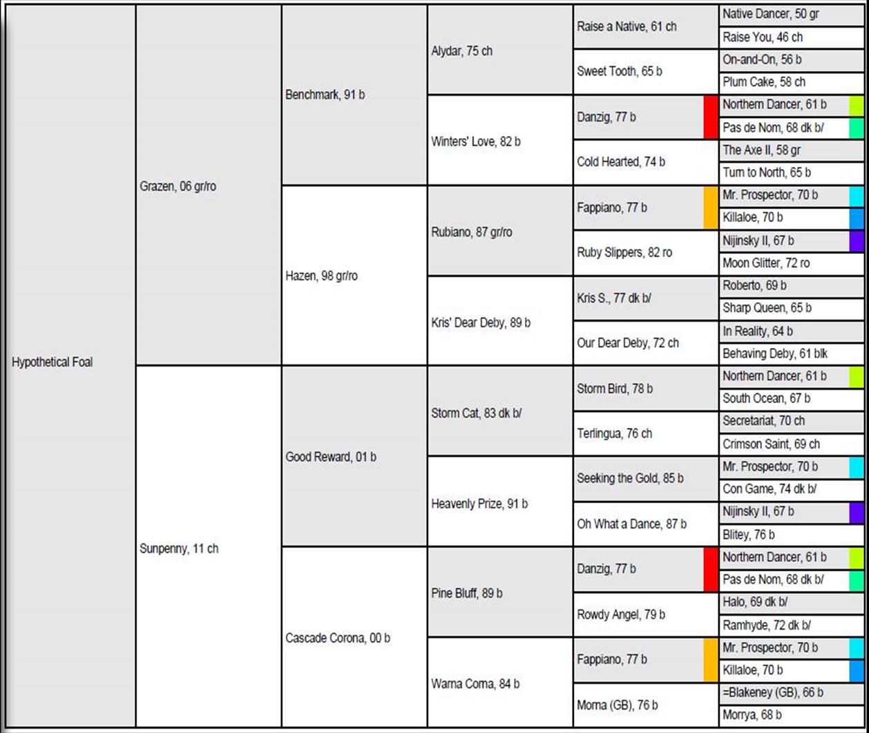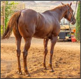 By GRAZEN (2006). Black type winner of $245,400, Affirmed H. [G3] (HOL, $60,000), etc. Sire of 9 crops of racing age, 241 foals, 150 starters, 11 black-type winners, 95 winners of 288 races and earning $10,996,305 including S Y Sky ($709,540, Monrovia S. [G3] (SA, $120,000), etc.), Enola Gray ($585,100, Wilshire S. [G3] (SA, $60,000), etc.), Just Grazed Me ($506,332, Senator Ken Maddy S. [G3] (SA, $60,000), etc.), Tough It Out ($498,641, Echo Eddie S.-R (SA, $110,000), etc.), Grazen Sky ($463,852), Lieutenant Dan (2021, $543,740). 1st dam Sunpenny by Good Reward. Winner at 2 and 3, $70,527, 2nd Northwest Farms S.-R (EMD, $8,750), 3rd Chandler S. [N]. Half-sister to Frisky Bear. Dam of 4 registered foals, 2 of racing age, 1 winner -- Sunny Ride (g. by Clubhouse Ride). Winner in 2 starts at 2, $10,950. 2nd dam CASCADE CORONA by Pine Bluff. 4 wins, 2 to 4, $91,000, Boeing H. (EMD, $22,000), King County H. (EMD, $22,000), etc. Half-sister to Son’s Corona, Basin City Ben. Dam of 4 foals to race, 3 winners, including-- Sunpenny (f. by Good Reward). Black-type-placed winner, above. Frisky Bear (f. by Nationhood). Winner at 2 and 3, $36,239, 2nd Washington Cup Juvenile Filly S.-R (EMD, $8,930). Muchas Coronas (f. by Macho Uno). Winner at 3 and 4, $40,732. Dam of -- Runnin’withdadevil (g. by Lucky Pulpit). Winner at 4, $42,300. Cascade Dancer (f. by Nationhood). Winner at 3 and 4, 2021, $21,880. La Una (f. by Tale of Ekati). Winner at 2 and 3, 2021, $26,488., 3rd Seattle Stakes (EMD, $6,000). KORON (f. by Nationhood). 3 wins in 3 starts at 2, 2021, $65,918, WA Cup Juvenile Fillies S.-R (EMD, $27,500), Barbara Shinpoch S.(EMD, $27,225). 3rd dam WARNA CORNA, by Fappiano. Winner at 2 and 3, $29,400. Sister to Dearly Bred [L], half-sister to CASUAL LIES [G3] (6 wins, $795,991, 2nd Kentucky Derby [G1], 3rd Preakness Stakes [G1]), LE FAMO [G3] (12 wins, $404,702, Vineland H. [G3]), Chist [L]. Dam of -- CASCADE CORONA, Black-type winner, above. Son’s Corona. 4 wins, 2 to 5, $264,913, 2nd Commonwealth Breeders’ Cup S. [G2], San Pedro S. [L] (SA, $16,110), Redwood City S. (BM, $8,000), 3rd Will Rogers H. [G3]. Sire. Basin City Ben. 4 wins, 2 to 4, $87,005, 2nd WTBA Lads S. (EMD, $8,100). Sarna. 2 wins, $22,538. Dam of STEALTH ATTACK (21 wins, $179,985, Overnight H. [N], Invitational H. [N] 3 times, etc.), PEBBLE BEACH BABY ($218,166, Sis City S. [N] etc.), dam of Mr. T's Thirsty ($54,820, 3rd Graduation S.-R, (DMR, $12,000), 2021), Yacht Spotter ($279,745, 2nd San Francisco Mile S. [G2] (GG, $60,000), etc.), Skyrider (Total $162,559, 3rd Muckleshoot Tribal Classic S.-R (EMD, $6,757), etc., set ncr at Turf Paradise), Tribute to Sissy ($19,528, 3rd Portland Glass Slipper S. [NR]). Inspirational. Unraced Dam of THE NIAGARA QUEEN [G2] (Total: $581,172, Dance Smartly S. [G2] (WO, $210,000), Flaming Page S. [L] (WO, $60,000, etc., dam of MAYAS QUEEN NEETEE, 6 wins, $305,523, Best of Ohio Distaff S.-R (BTP, $90,000), etc.), CHAPLAIN (8 wins, Total: $347,354, Caballos Del Sol S. [N]), My Girl Corey (to 4, $130,625, 3rd Pleasant Acres Stallions Distaff Turf S.-R (TAM, $10,000)), Granddam of Foxtrot Sally ($53,713, 3rd Rags to Riches S. (CD, $7,913), Etc.), Suprise Force (champion imported older mare in Dominican Republic).
